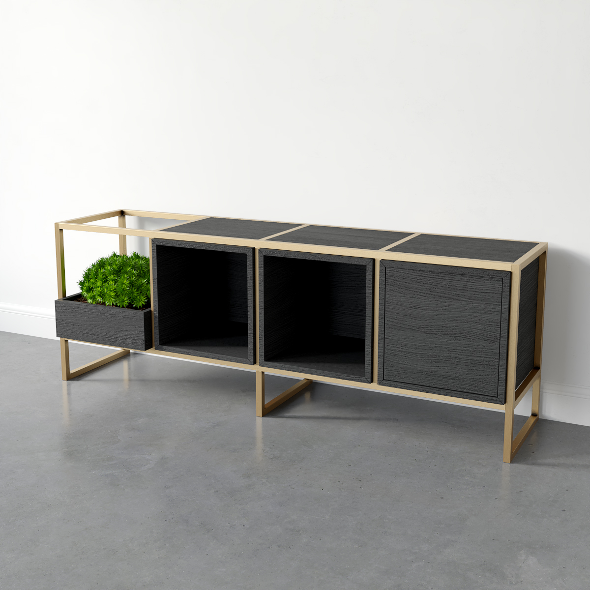 Komoda industrialna z elementami w kolorze dębu naturalnego to dobra baza do zaprojektowania niepowtarzalnego wnętrza w stylu minimalistycznym oraz wprowadzenia elementów urban jungle. Dostępne skrzynki i otwarte szafki doskonale komponują się z roślinnością różnego rodzaju.