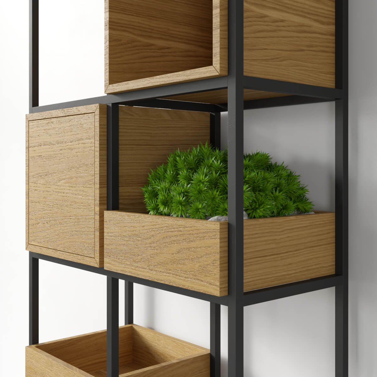 Metalowy stelaż regału loftowego w kolorze czarnym tworzy zgrabną kompozycję ze skrzynkami w kolorze dąb naturalny. Poszczególne moduły można przestawiać i wymieniać, a ich zagospodarowanie to już wyłącznie Twoja kreatywność. Loftowy regał do salonu może posłużyć jako wyjątkowa ozdoba i funkcjonalny element wystroju wnętrza.