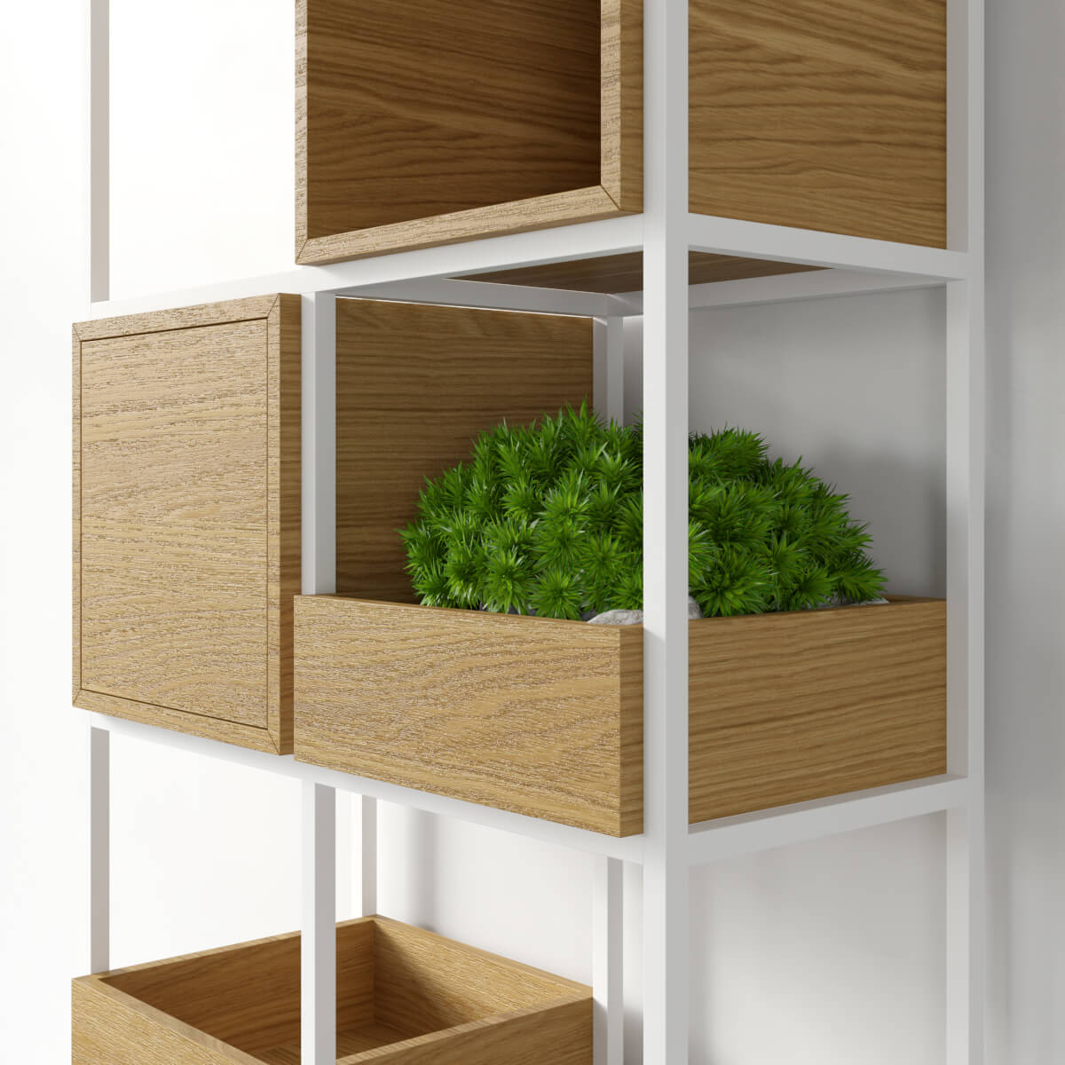 Projektowanie wnętrz HoReCa, aranżacja miejsc coworkingowych i projektowanie mebli na zamówienie do domu nauczyło nas, że wraz z minimalizmem i nowoczesnością musi iść w parze najważniejsza cecha – uniwersalizm. Między innymi także dlatego powstał ten model regału modułowego. Postawiliśmy w nim przede wszystkim na dowolność aranżacji. Aż osiem elementów umieszczonych w białej, metalowej ramie pozwala rozplanować regał na setki sposobów! Dwa otwarte i trzy zamknięte kubiki, a także dwie wygodne skrzynki oraz półka to wygodne, funkcjonalne elementy, niepozbawione jednak naturalnego uroku. Pasują do każdego wnętrza – sprawdzaliśmy to już wiele razy.